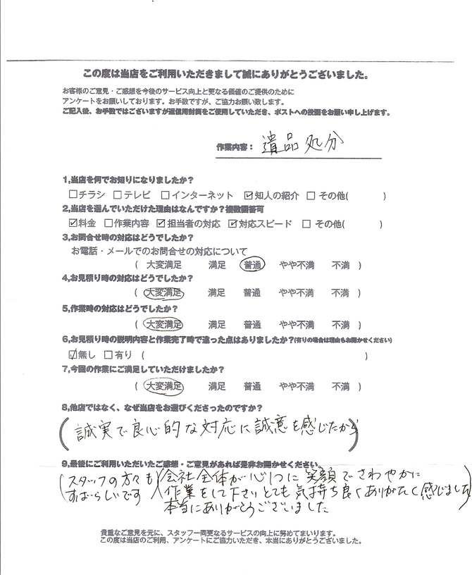 両親が亡くなり、長年空き家だったので片付けをお願いしました。どんなスタッフさんが来るのか不安でしたが、とても爽やかでお願いするとすぐに対応してくれる良い方で、安心感がありました。片付ける物がとにかく多くて大変な作業だったはずなのに、笑顔で対応してくださり、こちらも気分よく過ごすことが出来ました。感謝しています。