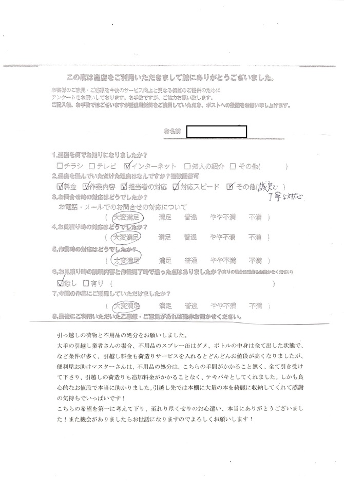 両親が亡くなり、長年空き家だったので片付けをお願いしました。どんなスタッフさんが来るのか不安でしたが、とても爽やかでお願いするとすぐに対応してくれる良い方で、安心感がありました。片付ける物がとにかく多くて大変な作業だったはずなのに、笑顔で対応してくださり、こちらも気分よく過ごすことが出来ました。感謝しています。
